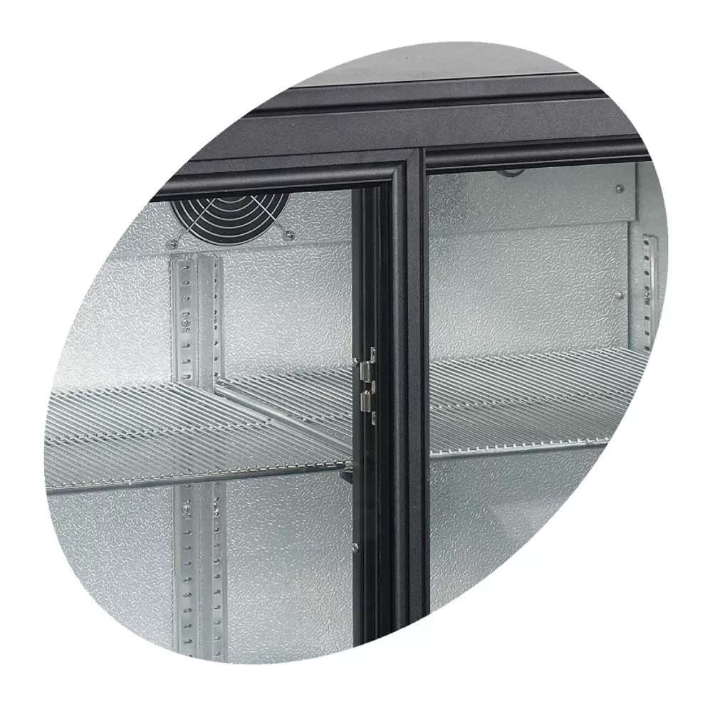 BA je řada vysoce kvalitních minibarů. Má hliníkové dveře a chromované police s dráty těsně u sebe, které zajišťují stabilitu a vysokou kapacitu. Dveře s dvojitým sklem nabízejí skvělou viditelnost výrobků a nižší spotřebu energie. Je k dispozici s 1, 2 a 3 dveřmi – můžete si vybrat mezi křídlovými a posuvnými dveřmi. Aby se minibar vešel do jakéhokoliv baru, dodává se ve dvou výškách: 870 mm a 900 mm. dvojité tvrzené sklo|samozavírací posuvné prosklené dveře|snadno přístupný elektronický termostat|nastavitelné police|nastavitelné nožky|vnitřní LED osvětlení|ventilované chlazení