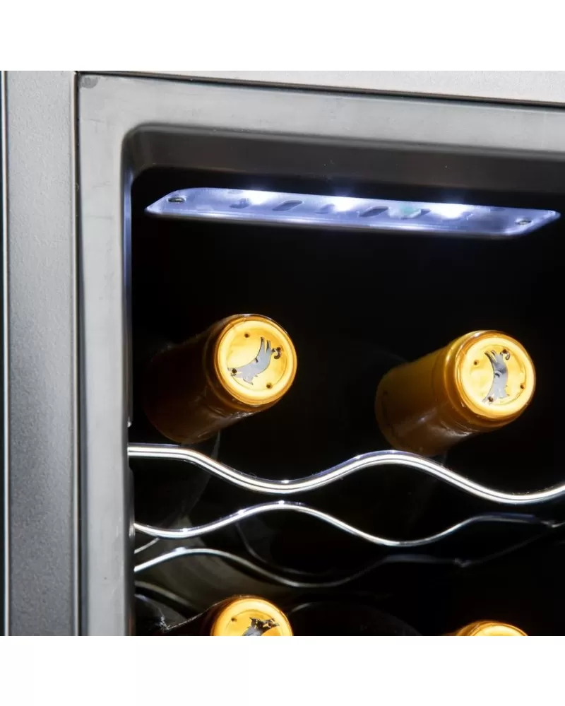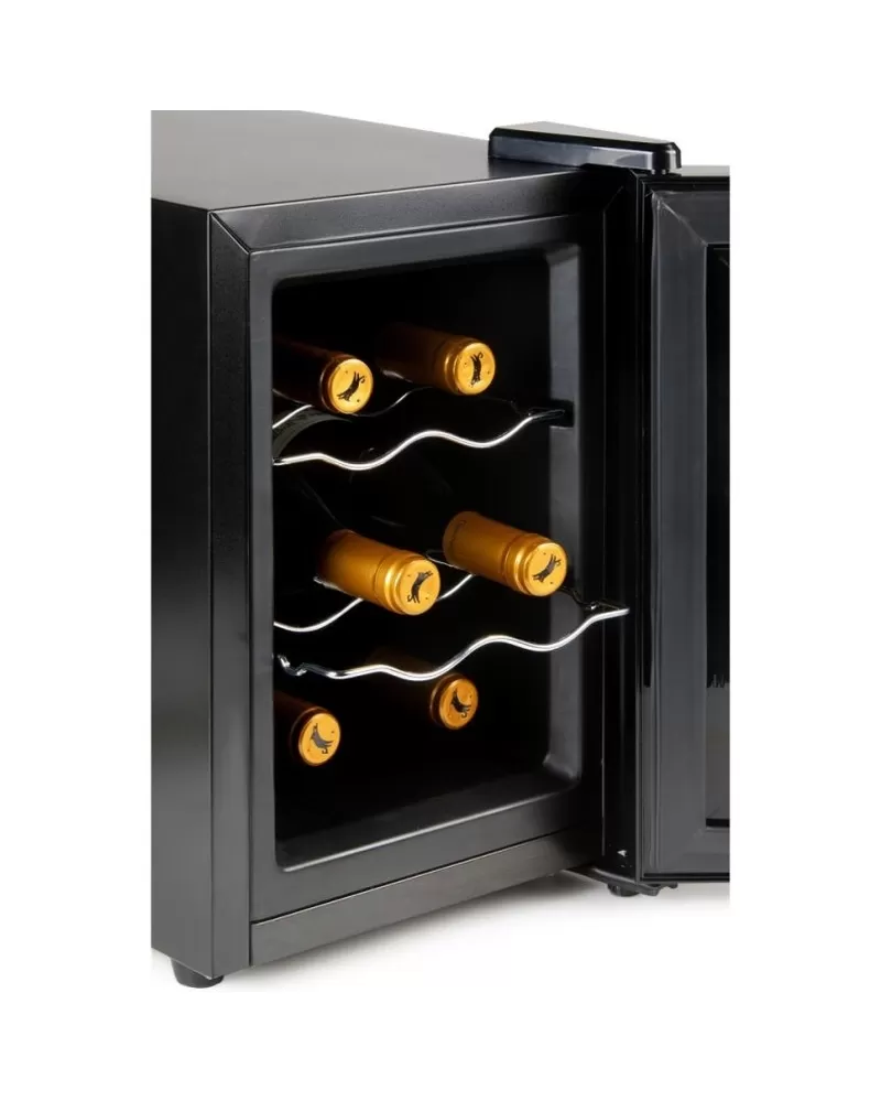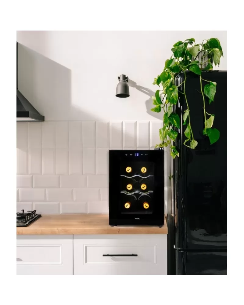 Domácí vinotéka kompaktních rozměrů a kapacitou na 6 lahví je ideální volbou pro lidi s menším bytem, kteří ale nechtějí dělat ústupky a vždy si vychutnat víno v té nejlepší kvalitě. Víno z vinotéky bude vždy vychlazené na správnou teplotu, kterou si lze jednoduše nastavit i sledovat na podsvíceném LED displeji. Svým elegantním designem s vnitřním LED bílým osvětlením doplní váš interiér.