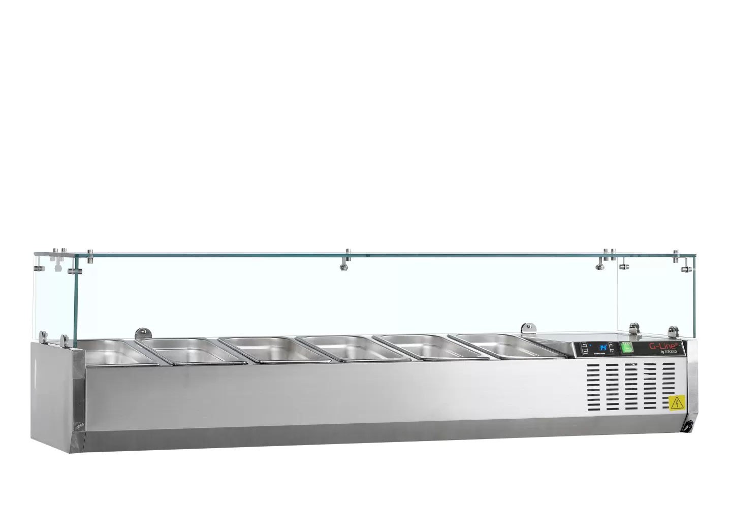 Chladicí nástavba na gastronádoby GN 1/4 vhodná pro pizzerie, rychlá občerstvení či menší provozovny. Gastronádoby nejsou součástí. GVC33-120: 5 x GN 1/4 GVC33-150: 7 x GN 1/4 GVC33-180: 9 x GN 1/4 GVC33-200: 10 x GN 1/4 nerezová ocel|skleněné krytí na ochranu potravin|lze vložit GN1/4 (nejsou součástí balení)|digitální termostat a teplotní displej|statické chlazení|nastavitelné nožky Chladicí pult pro nádoby GN1/4