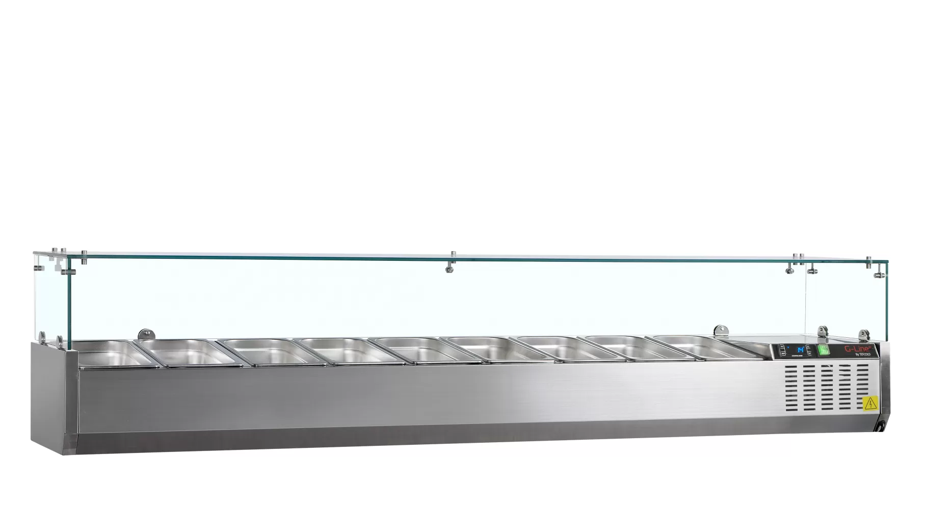 Chladicí nástavba na gastronádoby GN 1/4 vhodná pro pizzerie, rychlá občerstvení či menší provozovny. Gastronádoby nejsou součástí. GVC33-120: 5 x GN 1/4 GVC33-150: 7 x GN 1/4 GVC33-180: 9 x GN 1/4 GVC33-200: 10 x GN 1/4 nerezová ocel|skleněné krytí na ochranu potravin|lze vložit GN1/4 (nejsou součástí balení)|digitální termostat a teplotní displej|statické chlazení|nastavitelné nožky Stolní chladicí nástavba GN1/4