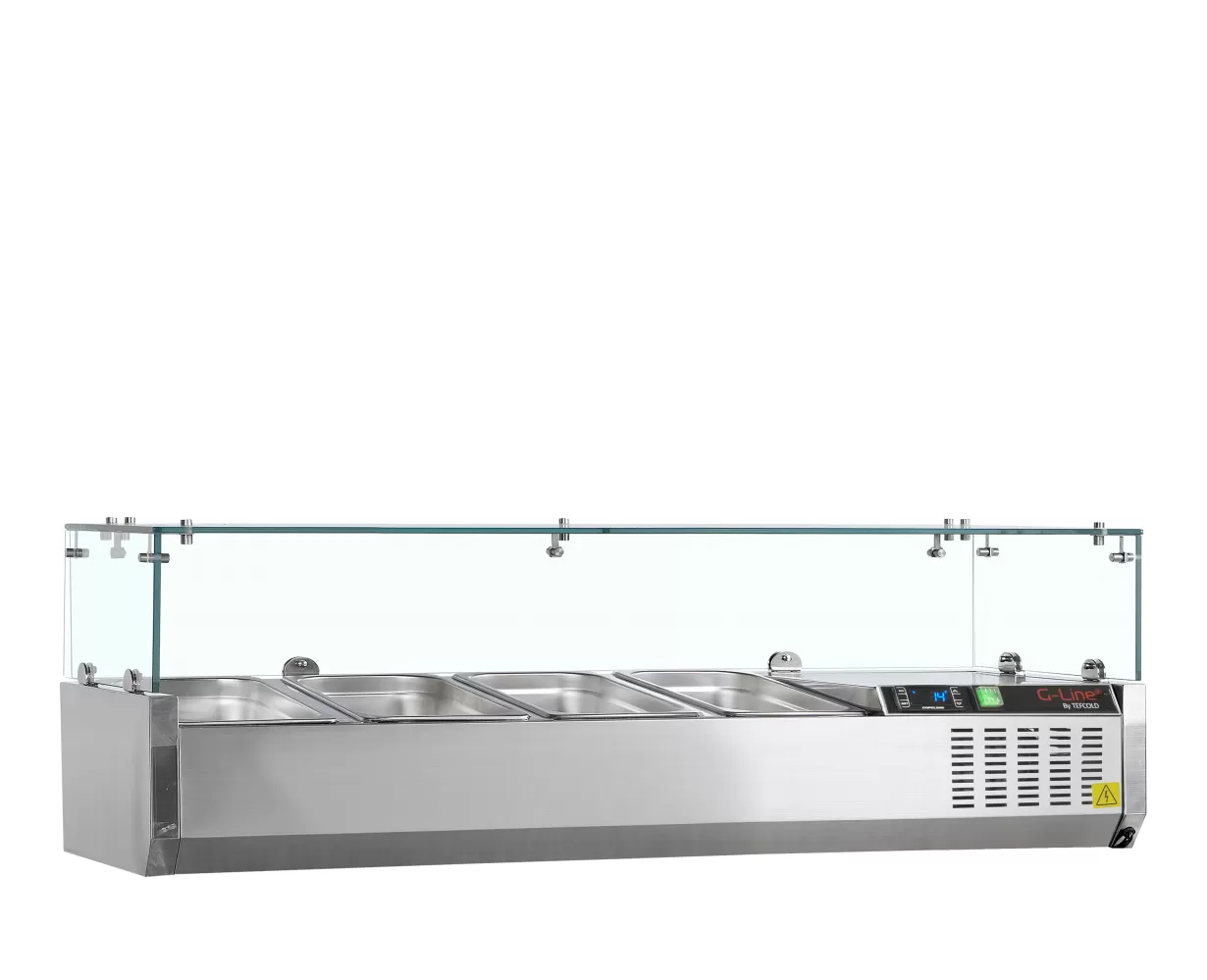 Řada chladicích nástaveb GVC38 je skvělým doplňkem gastro pultů, protože vám umožňuje mít na dosah vše, co potřebujete k přípravě jídla. Je vhodná pro gastronádoby GN 1/3 a GN 1/2 x 150 mm (nejsou součástí) GVC33-120: 4 x GN 1/3 nebo 3 x GN 1/3 + 1 x GN 1/2 GVC33-150: 6 x GN 1/3 nebo 5 x GN 1/3 + 1 x GN 1/2 nerezová ocel|skleněné krytí na ochranu potravin|přizpůsobeno GN1/3 (nejsou součástí balení)|digitální termostat a teplotní displej|statické chlazení|nastavitelné nožky Stolní chladicí nástavba GN1/3