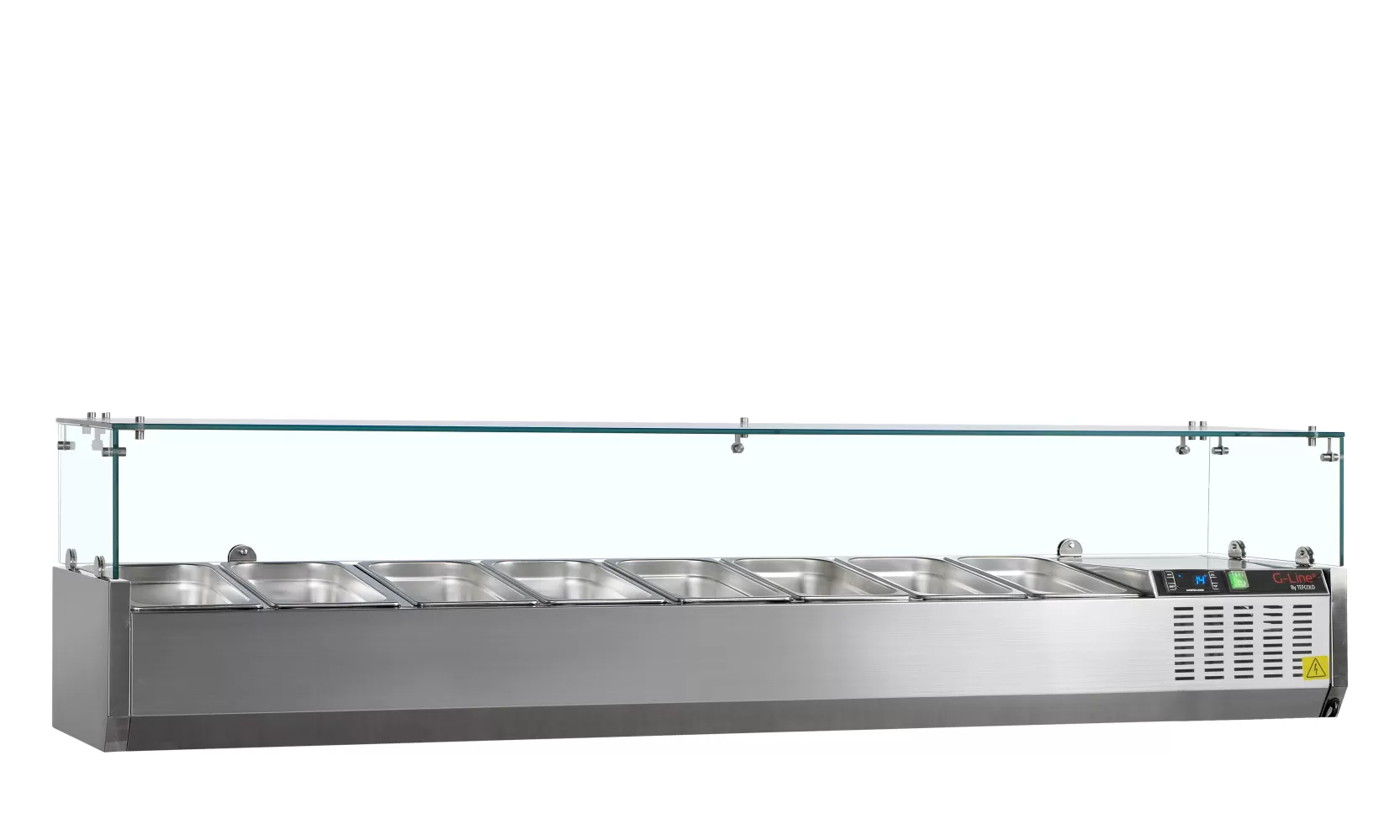 The GVC38 range of vitrine coolers is a great addition to gastro counters, as it enables you to have everything you need for food preparation within reach. It accepts GN1/3, GN1/6 and GN1/2 pans (not included). The cooler is made in SS201 stainless steel with a glass sneezeguard to protect the food. Ideal for pizza places, fast food restaurants, and sandwich shops. nerezová ocel|skleněné krytí na ochranu potravin|přizpůsobeno GN1/3 (nejsou součástí balení)|digitální termostat a teplotní displej|statické chlazení|nastavitelné nožky Stolní chladicí nástavba GN1/3