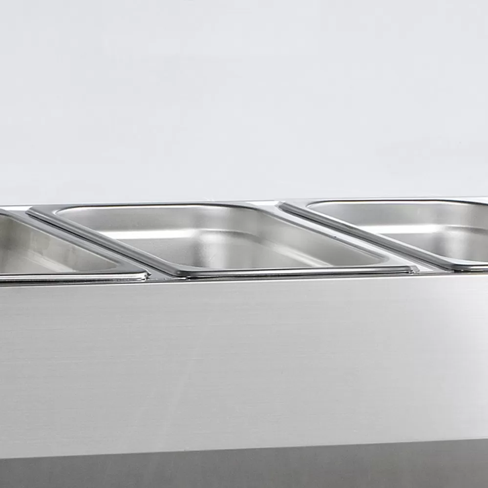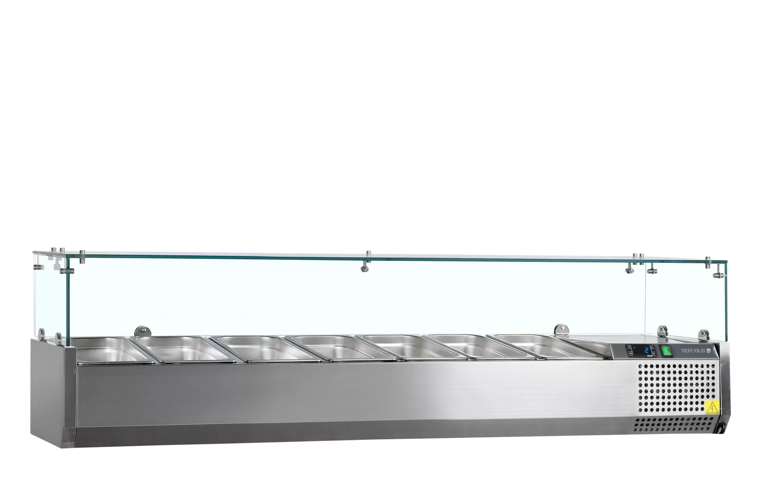 Řada chladicích nástaveb VK38 je skvělým doplňkem gastro pultů, protože vám umožňuje mít na dosah vše, co potřebujete k přípravě jídla. Je vhodná pro gastronádoby GN 1/3 a GN 1/2 x 150 mm (nejsou součástí). VK38-120: 4 x GN 1/3 nebo 3 x GN 1/3 + 1 x GN 1/2 VK38-150: 6 x GN 1/3 nebo 5 x GN 1/3 + 1 x GN 1/2 VK38-160: 7 x GN 1/3 nebo 5 x GN 1/3 + 1 x GN 1/2 VK38-180: 8 x GN 1/3 VK38-200: 9 x GN 1/3 nerezová ocel|statické chlazení|skleněné krytí na ochranu potravin|nastavitelné nožky|přizpůsobeno GN1/3 (nejsou součástí balení) Stolní chladicí nástavba.