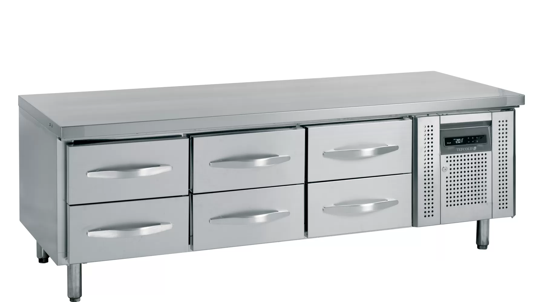 Řada UC chladicích podestaveb se zásuvkami je určena pro profesionální kuchyně a disponuje zásuvkami s rozměry GN1/1. Chladničky jsou vyrobeny z nerezové oceli SS304 a jsou k dispozici se 4, 6 nebo 8 zásuvkami. Systém s ventilovaným chlazením zajišťuje rychlé snížení teploty a její rovnoměrné rozložení. Nastavení teploty lze upravit pomocí elektronického termostatu. K dispozici jsou také podobné modely s dvířky místo zásuvek. nerezová ocel|automatické odmrazování|zásuvky GN 1/1|nastavitelné nohy|ventilované chlazení Chladicí podestavba se zásuvkami