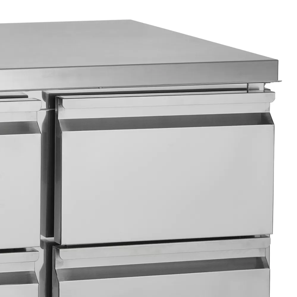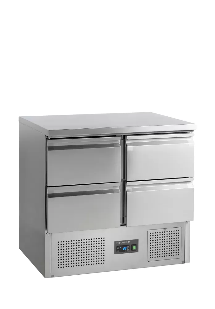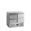 Řada SA chladicích saladet je vyrobena v celonerezovém provedení SS304 s plnými dveřmi a zásuvkami. Vnitřní prostor obsahuje roštovou polici GN1/1 (1x ve dveřích). Model je dodáván bez GN. Saladety jsou k dispozici v různých velikostech. nerezová ocel|automatické odmrazování|zásuvka/ky|nastavitelné nožky|chlazení s pomocným ventilátorem Chladicí saladeta s pracovní deskou a šuplíky