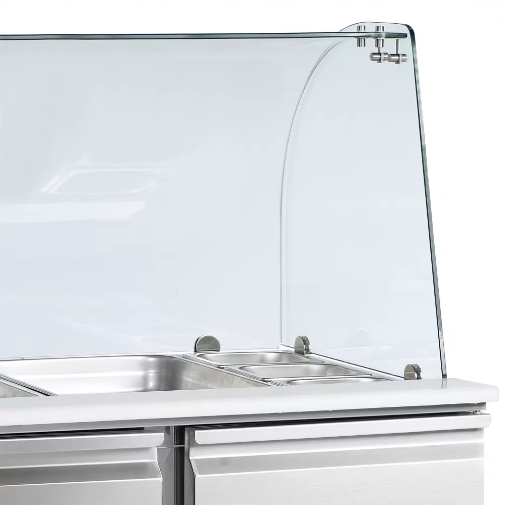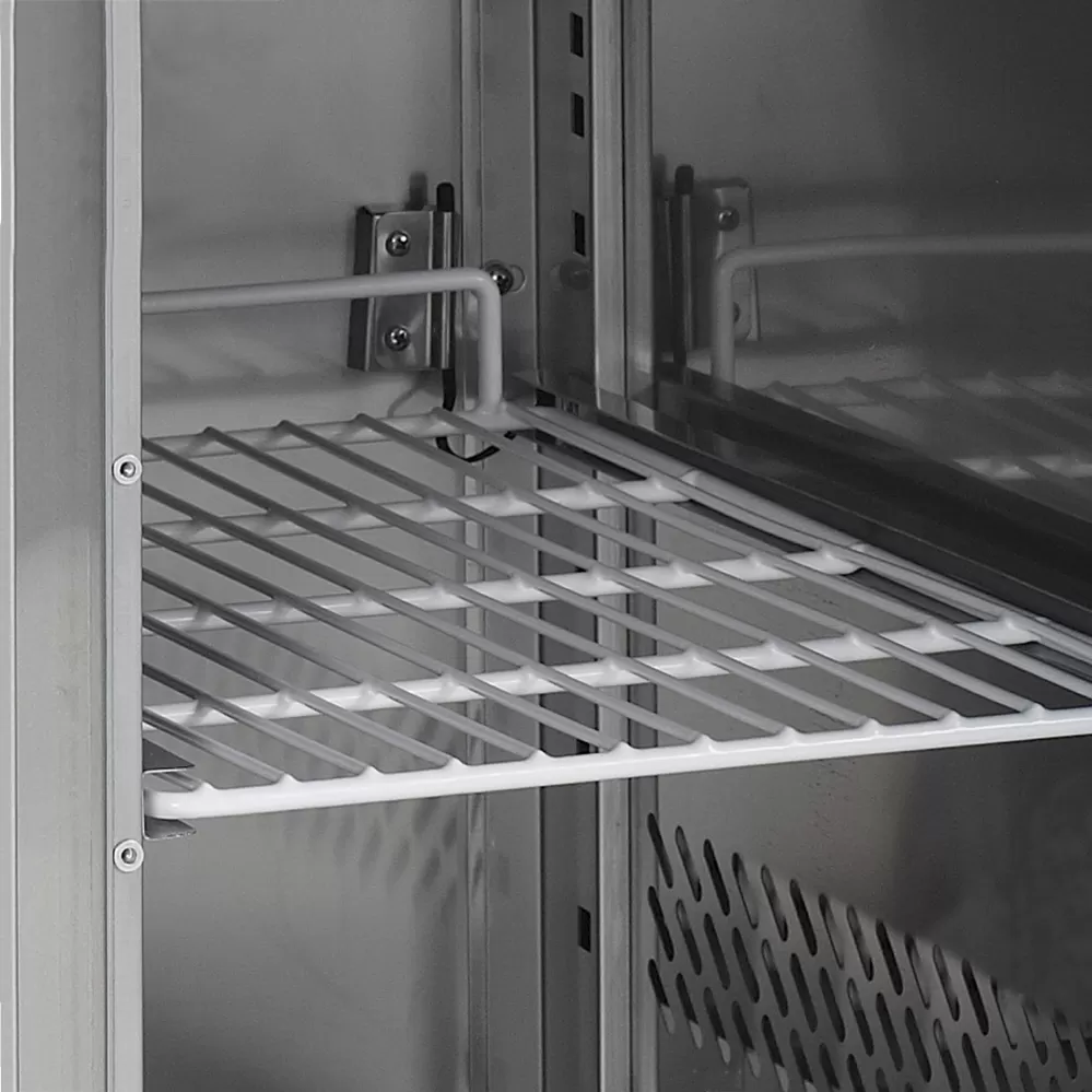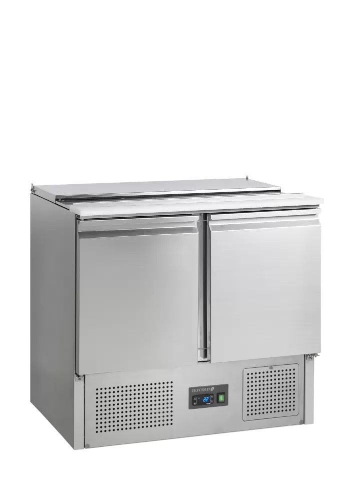 Řada SA chladicích saladet je vyrobena v celonerezovém provedení SS304 s plnými dveřmi. Vrchní chlazený prostor pro ukládání GN 1/1 je dodáván s nerezovým zákrytem a plastovou pracovní plochou. Vnitřní prostor obsahuje roštovou polici GN1/1 (1x ve dveřích). Model je dodáván bez GN. Saladety jsou k dispozici v různých velikostech. Modely s otevřenou horní deskou pro nádoby GN se dodávají se skleněnou deskou nebo bez ní. nerezová ocel|otevřená horní část pro gastronádoby|digitální termostat a teplotní displej|automatické odmrazování|nastavitelné nožky|chlazení s pomocným ventilátorem|krájecí deska Saladeta dvoudveřová v kompletním nerezovém provedení (náhrada za NORDline GN 100 SA new).