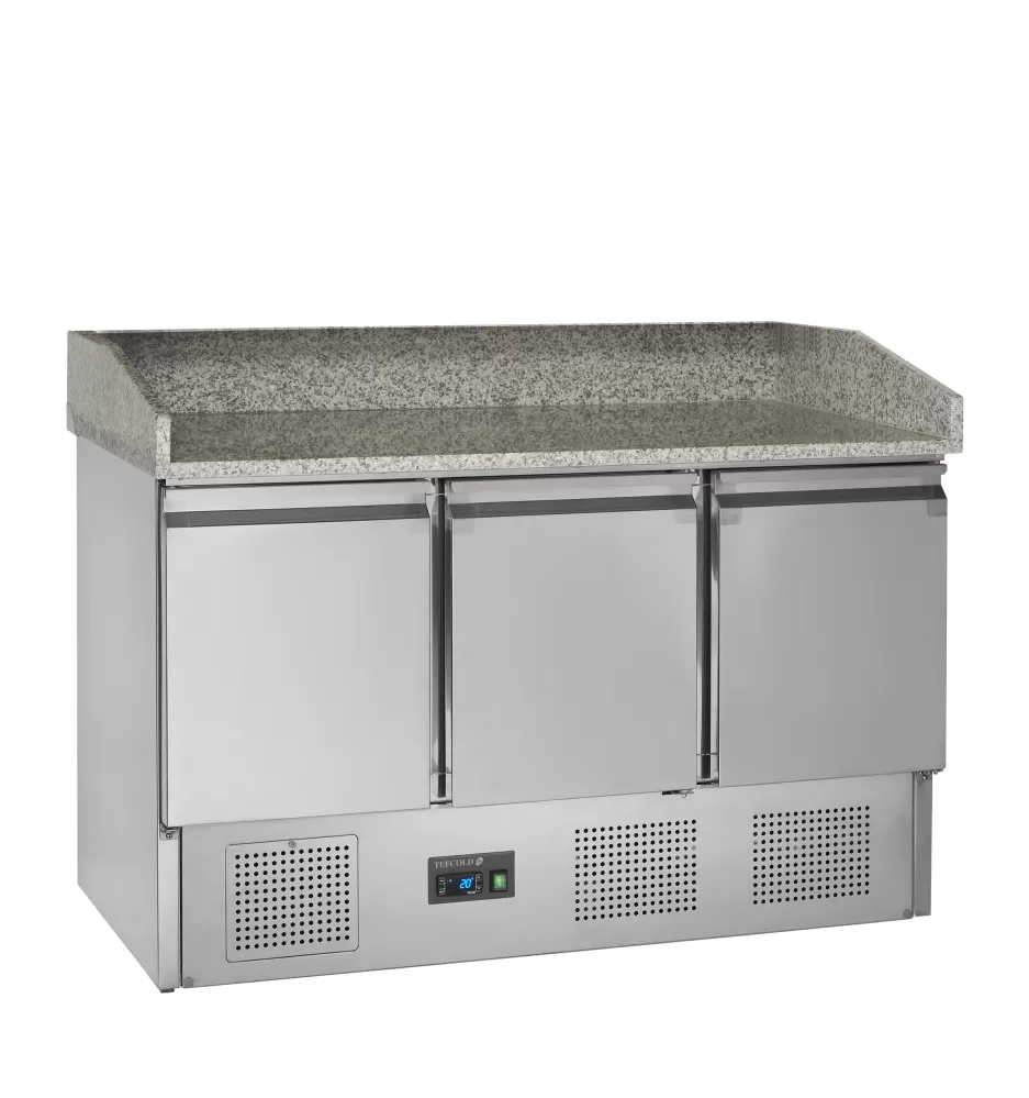 Řada PT chladicích pizza stolů je vyrobena z nerezové oceli SS304. Má žulovou desku, která je pro přípravu pizzy ideální, protože žula zůstává chladná a těsto se na ni méně lepí. Stoly jsou k dispozici v několika velikostech se 2 nebo 3 dvířky. Také je možné pořídit si přizpůsobenou variantu se zásuvkami. Dodává se s horní jednotkou pro gastronádoby GN nebo bez ní – horní jednotku lze dodatečně namontovat. nerezová ocel|žulová pracovní deska|automatické odmrazování|dveře|nastavitelné nožky|chlazení s pomocným ventilátorem Chladicí pizza stůl Gastronorm s žulovou pracovní deskou