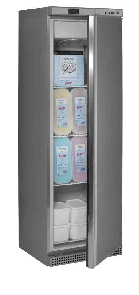 Řada mrazicích skříní UF-VS je verzí našich nerezových mrazicích skříní s ventilovaným chlazením. Dodává se v různých velikostech. Mrazicí skříň má účinný ventilační chladicí systém, který zajišťuje rovnoměrnou teplotu v celé skříni. Teplotu nastavíte na snadno ovladatelném digitálním displeji termostatu. Mrazničku si můžete přizpůsobit svým potřebám díky nastavitelným policím. Odmrazování probíhá automaticky. nerezové provedení|integrované madlo|plné dveře, lze měnit otevírání|elektronický termostat |automatické odmrazování|nastavitelné police|ventilované chlazení|zámek|nastavitelné nožky s pojezdovými válečky vzadu