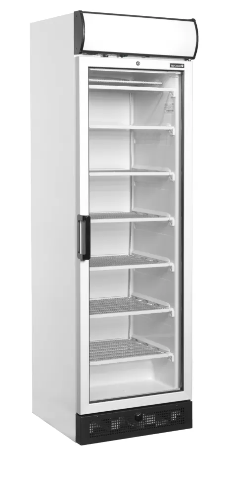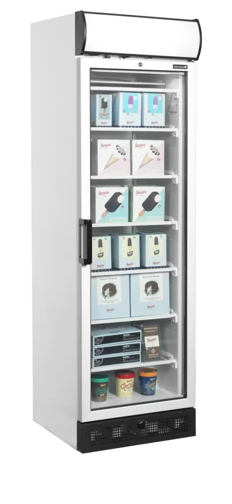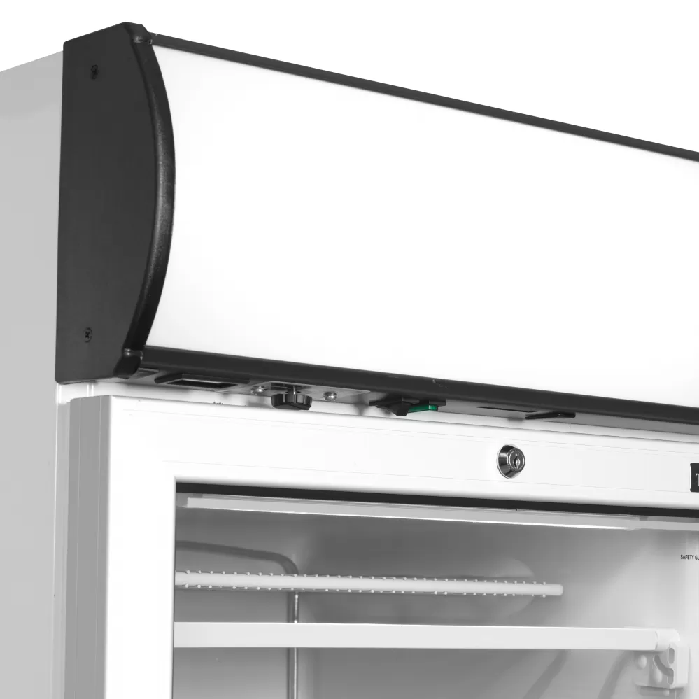 Řada mrazicích skříní UFFS nabízí skvělou prezentaci výrobků a konkurenceschopnou cenu. Má vyhřívané prosklené dveře, které zabraňují kondenzaci, a umožňuje odtok vody při rozmrazování pro snadnou údržbu. Má statické chlazení a pevné výparníkové police. vynikající prezentace produktů|světelný reklamní panel|vyhřívané prosklené dveře|pevné chlazené police|vnitřní LED osvětlení|digitální teploměr|odtok vody při odmrazování|nastavitelné nožky Mraznička s reklamním panelem a vyhřívanými prosklenými dveřmi