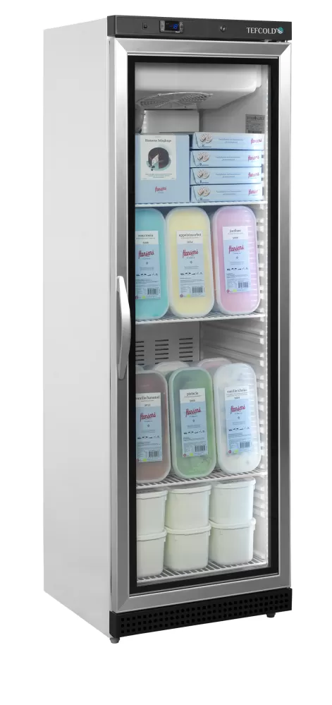 Řada mrazicích skříní UF-VG je verzí našich bílých mrazicích skříní s prosklenými dveřmi a ventilovaným chlazením. Dodává se v různých velikostech a nabízí velkou flexibilitu díky nastavitelným policím. Účinné ventilované chlazení zajišťuje rovnoměrnou teplotu v celé skříni. Teplotu lze nastavit na snadno ovladatelném digitálním displeji termostatu. Odmrazování probíhá automaticky. vyhřívané prosklené dveře|elektronický termostat |automatické odmrazování|nastavitelné police|vnitřní LED osvětlení|ventilované chlazení|zámek|nastavitelné nožky s pojezdovými válečky vzadu Jednodveřová mrazicí skříň s prosklenými dveřmi