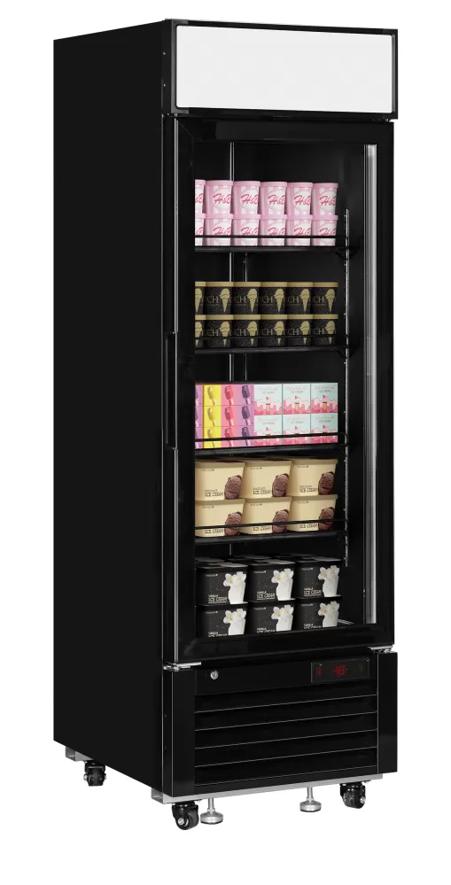 Řada mrazicích skříní s prosklenými dveřmi LGF-B je navržena pro elegantní a efektivní vystavování v maloobchodních provozech. Dodává se s 1, 2 nebo 3 dveřmi. Je vybavena nastavitelnými policemi, vyhřívanými prosklenými dveřmi a dvěma LED světly na každé dveře pro optimální prezentaci výrobků. Dodává se s LED reklaním panelem a je ideální pro branding, který přitáhne pozornost. Díky energeticky úspornému chladicímu systému oceníte nízké provozní náklady a vaše výrobky budou vždy při ideální teplotě. K dispozici také v chladicí verzi (LGC). reklamní panel s LED osvětlením|vyhřívané sklo zabraňující kondenzaci|samozavírací dveře se zarážkou na otevření pro snadné plnění|nastavitelné police|digitální termostat a teplotní displej|vnitřní LED osvětlení s vypínačem|vnitřní základna z nerezové oceli|ventilované chlazení|automatické odmrazování|kolečka a nastavitelné nožičky Elegantní černá mrazicí skříň s reklamním panelem