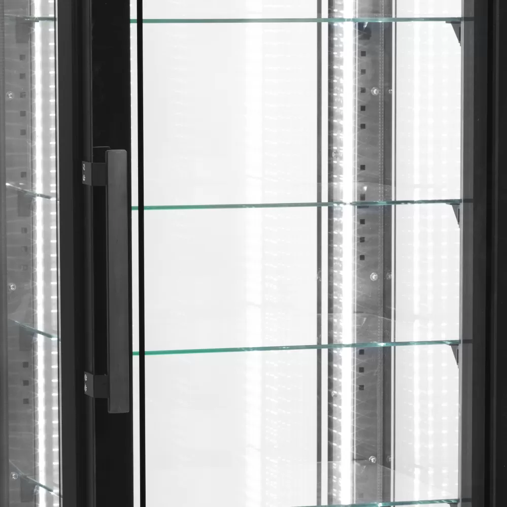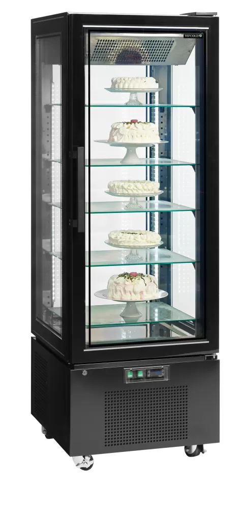 Mrazicí vitrína TEFCOLD UPD 400 F Black má všechny čtyři strany prosklené s dvojitým izolačním sklem, což zajišťuje vynikající prezentaci vystavených produktů. Má také bezrámové dveře s vyhřívaným rámem. Výšku mezi skleněnými policemi je možné změnit dle potřeby. Vitrína je skvělá např. pro prezntaci zmrzlinových pohárů a jiných mražených pochutin. dvojité izolační sklo na čtyřech stranách|prosklené dveře bez rámu|vynikající prezentace produktů|vnitřní LED osvětlení|černý ocelový exteriér|nerezový interiér se zrcadlovým efektem|nastavitelné skleněné police|mrazicí jednotka Mrazicí panoramatická vitrína