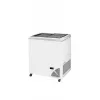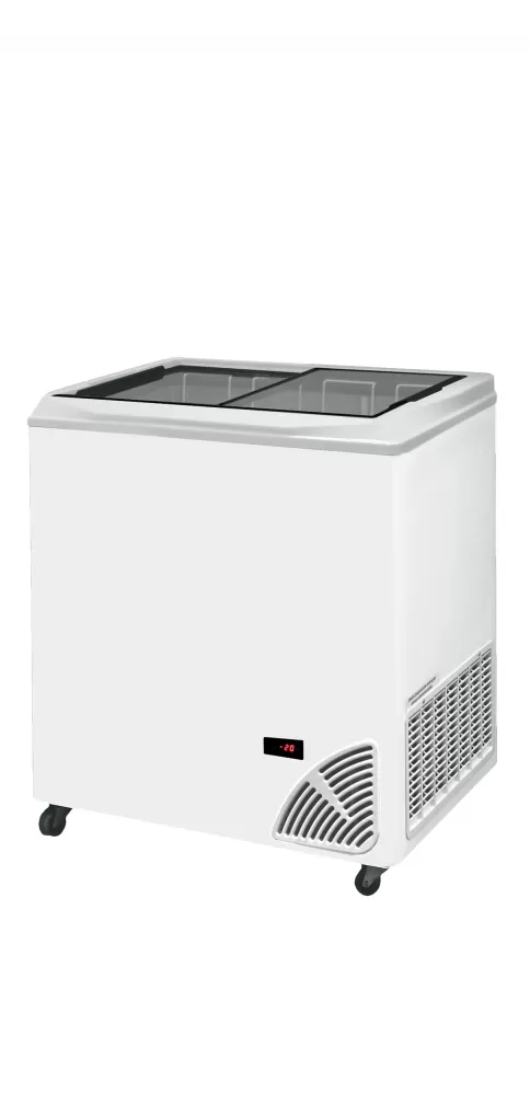 Prosklené mrazničky Byfal jsou k dostání ve třech bravách: červená, šedá, bíla a ve dvou provedeních: s rovným víkem a oblým víkem. Vyznačují se vynikajícími izolačními vlastnostmi. Vnější plášť je vyroben z pozinkovaného plechu, ten je z vnější strany potažen PVC, což jej činí odolnější proti korozi a poškrábání. Vnitřní stěny mrazničky jsou z Alu plechu o čistotě 99 % mimo dna, to je vyrobeno z ocelového plechu s povrchovou úpravou pro styk s potravinami. Vrchní krytí je z tvrzeného skla s termickou vrstvou,která zajistí lepší izolaci.Víko je opatřeno zámkem. Kompresor řídí digitální termostat s displejem, který znázorňuje aktuální teplotu. Ve standardní výbavě se nachází plný počet košů, do kterých je možno objednat dělící přepážky pro rozdělení mražených potravin. statické chlazení|vestavěný agregát|manuální odmrazování|digitální termostat s teploměrem|síla izolace stěny - 65 mm|bílé opláštění, uvnitř ALU|koše jsou součástí|zámek|kolečka Pultová mraznička s posuvným rovným víkem a digitálním termostatem s teploměrem