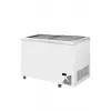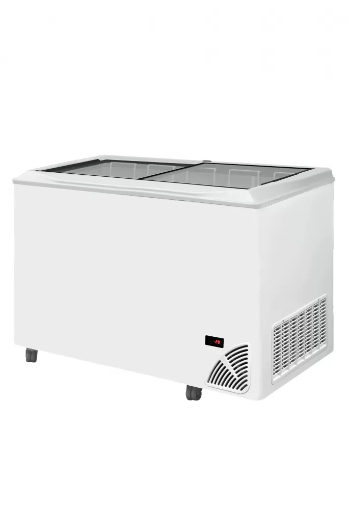 Prosklené mrazničky Byfal jsou k dostání ve třech bravách: červená, šedá, bíla a ve dvou provedeních: s rovným víkem a oblým víkem. Vyznačují se vynikajícími izolačními vlastnostmi. Vnější plášť je vyroben z pozinkovaného plechu, ten je z vnější strany potažen PVC, což jej činí odolnější proti korozi a poškrábání. Vnitřní stěny mrazničky jsou z Alu plechu o čistotě 99 % mimo dna, to je vyrobeno z ocelového plechu s povrchovou úpravou pro styk s potravinami. Vrchní krytí je z tvrzeného skla s termickou vrstvou,která zajistí lepší izolaci.Víko je opatřeno zámkem. Kompresor řídí digitální termostat s displejem, který znázorňuje aktuální teplotu. Ve standardní výbavě se nachází plný počet košů, do kterých je možno objednat dělící přepážky pro rozdělení mražených potravin. statické chlazení|vestavěný agregát|manuální odmrazování|digitální termostat s teploměrem|síla izolace stěny - 65 mm|bílé opláštění, uvnitř ALU|koše jsou součástí|zámek|kolečka Pultová mraznička s posuvným rovným víkem a digitálním termostatem s teploměrem