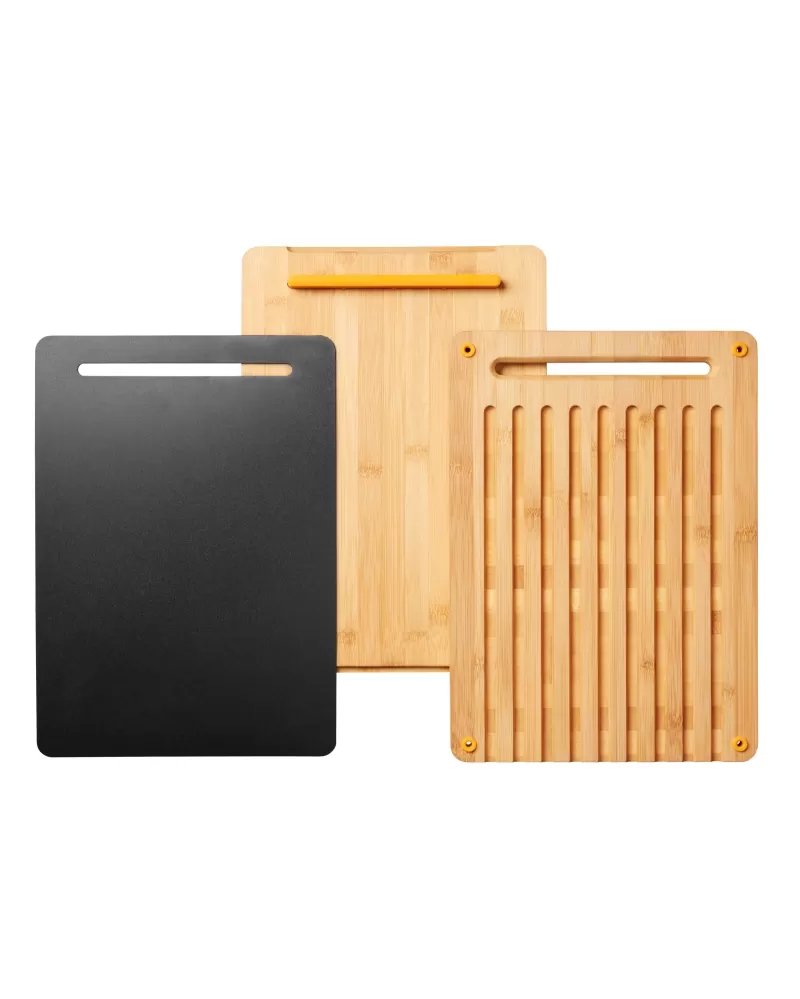 Sada bambusových prkének na krájení Fiskars 1057550 Třídílná sada na krájení Prkénko na krájení chleba a jiného pečiva s drážkami Ploché… Celý popis