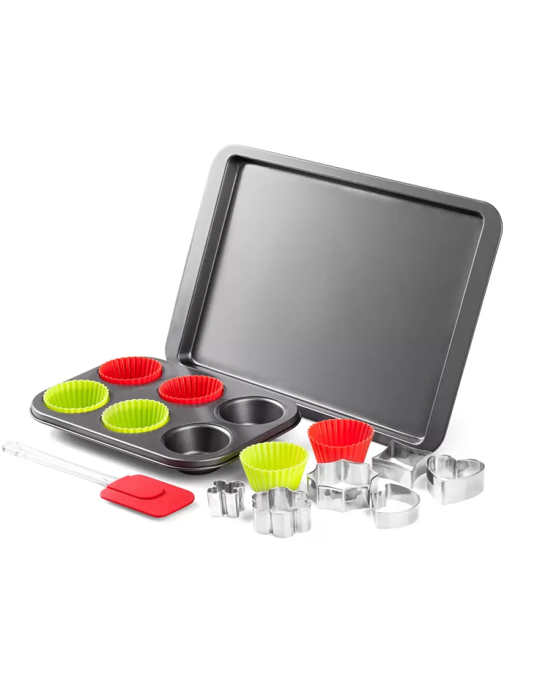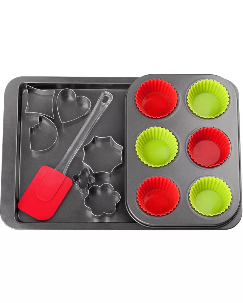 • Sada obsahuje: pečící plech, formu na 6 muffinů, silikonovou stěrku, 6ks vykrajovátek a 6ks silikonových košíčků